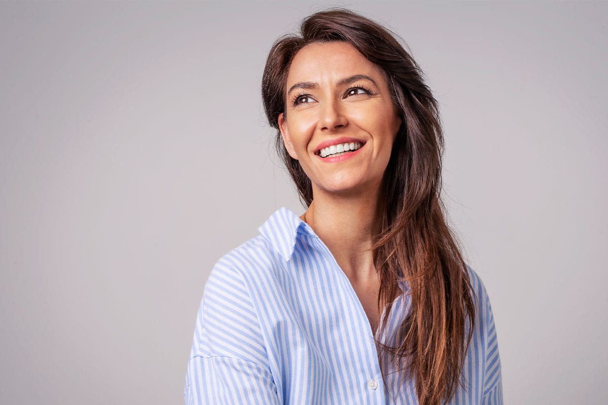 a woman smiling and looking at the camera after getting bioidentical hormone replacement therapy in The Villages.